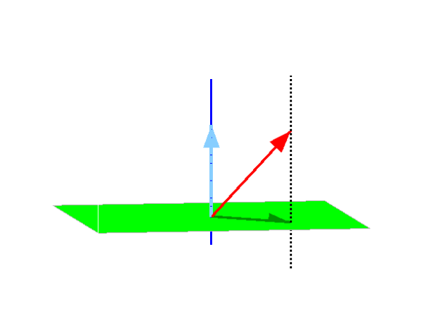 // plan P de projection // P=Vect(i,j) plot3d([-1,1],[-1,1],[0,0;0,0]) // droite D de direction de projection // D=Vect(k) avec u=(0,0,1)=0.i+0.j+1.k u=[0,0,3] t=[-0.2,1] ; param3d(t*u(1),t*u(2),t*u(3)) // vecteur x à projeter sur P parallèlement à D // x=(-1/2,1/2,1/2)=(-1/2).i+1/2.j+1/2.k x=[-1/2,1/2,2] t=[0,1] ; param3d(t*x(1),t*x(2),t*x(3)) // vecteurs xP et xD param3d(t*x(1),t*x(2),t*0) param3d(t*0,t*0,t*x(3)) // trace pour règle du parallélogramme t=[-1,0.4] param3d(x(1)+t*u(1),x(2)+t*u(2),x(3)+t*u(3))