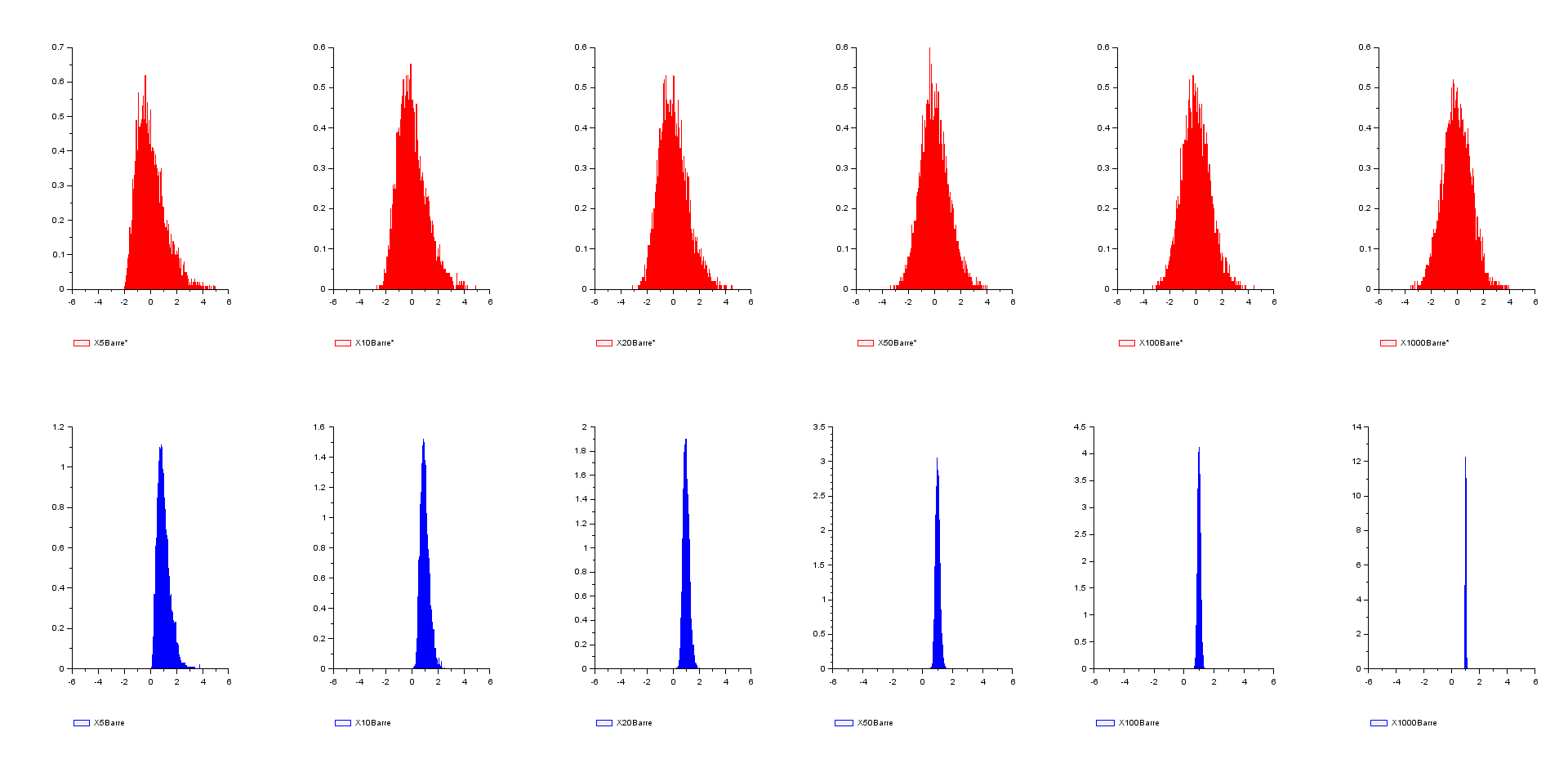 // comparatif de convergence entre // - loi faible des grands nombres (bleu) --> valeur de la limite // - théorème de la limite centrée (rouge) --> étalement des résultats autour de la limite // pour une même suite de loi exponentielles de paramètre 1 N=1d4 ; nmax=1d3 ; m=1 ; s=1 X=grand(N,nmax,"exp",m) liste_n=[5,10,20,50,100,nmax] r=length(liste_n) for i=1:r n=liste_n(i) Z=mean(X(:,1:n),'c') Y=(Z-m)/s*sqrt(n) subplot(2,r,i) histplot([-5:0.01:5],Y,5,leg="X"+string(n)+"Barre*") subplot(2,r,i+r) histplot([-5:0.01:5],Z,2,leg="X"+string(n)+"Barre") end