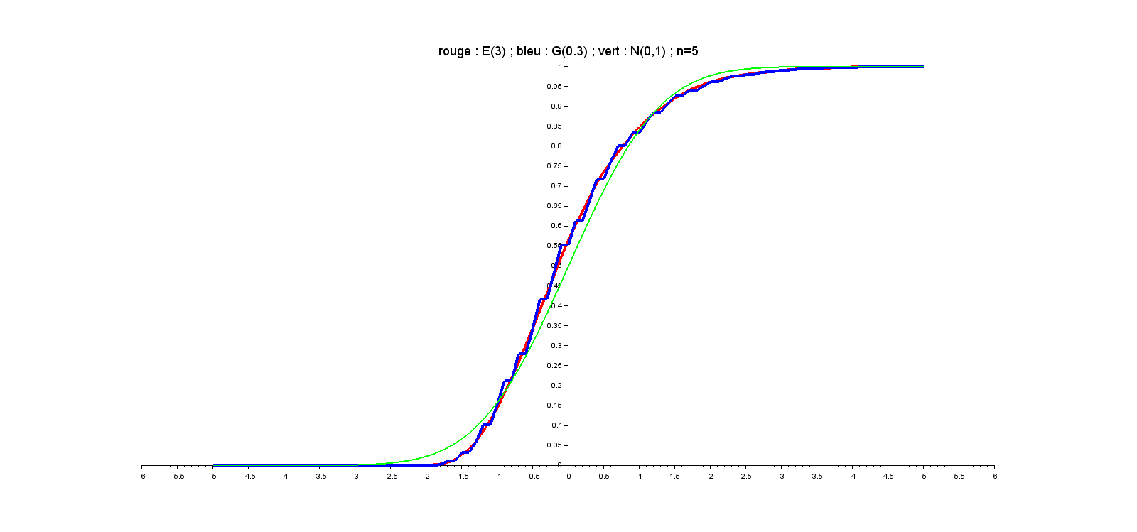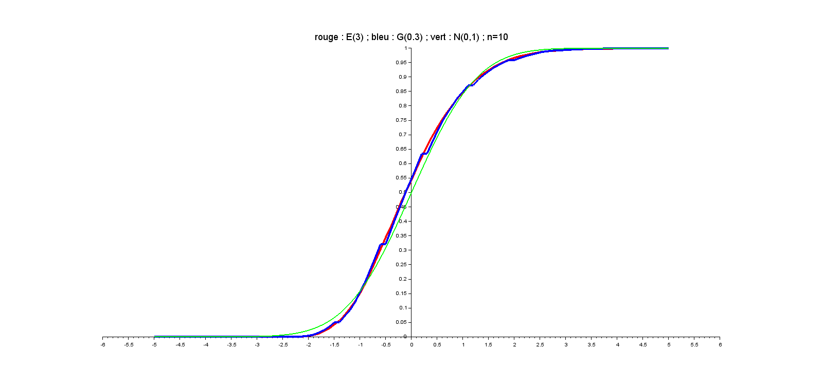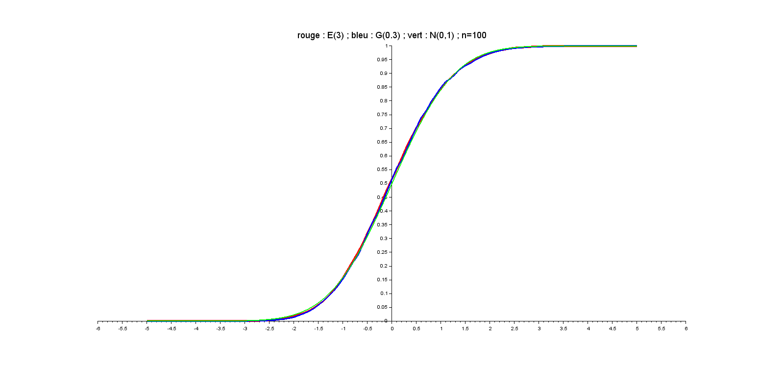 // Comparatif des répartitions : // loi N(0,1) // somme centrée réduite de lois E(lambda) // somme centrée réduite de lois G(p) n=input("n=") ; lambda=input("lambda=") ; p=input("p=") m=10000 ; Y=zeros(1,m) ; Z=zeros(1,m) for k=1:m X=grand(1,n,"exp",1/lambda) Y(k)=sqrt(n)*(mean(X)-1/lambda)*lambda X=grand(1,n,"geom",p) Z(k)=sqrt(n)*(mean(X)-1/p)/(sqrt(1-p)/p) end abscisses=[-5:0.1:5]' FY=zeros(abscisses) ; FZ=zeros(abscisses) [Phi,Psi]=cdfnor("PQ",abscisses,zeros(abscisses),ones(abscisses)) for k=1:length(abscisses) FY(k)=length(find(Y<=abscisses(k)))/m FZ(k)=length(find(Z<=abscisses(k)))/m end plot2d(abscisses,[FY,FZ,Phi],[5,2,3]) // 5->rouge, 2->bleu 3->vert