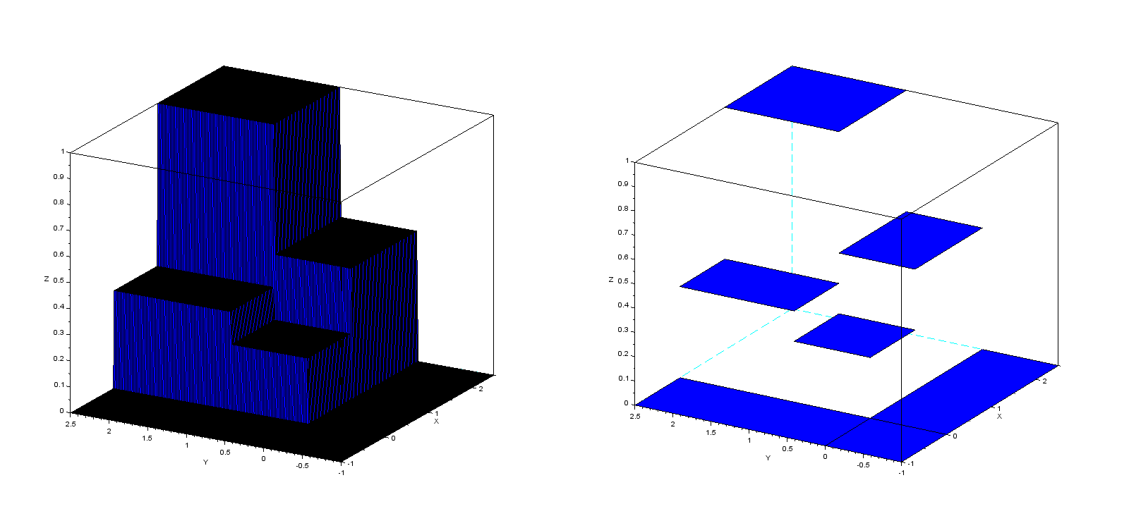 // 1ère version subplot(1,2,1) function z=F(x, y) if (x<0)|(y<0) then z=0 elseif (x<1)&(y<1) then z=1/4 elseif (x>=1)&(y<1) then z=1/2 elseif (x<1)&(y>=1) then z=3/8 else z=1 end endfunction x=[-1:0.02:2.5] ; y=x ; fplot3d(x,y,F) // 2nde version (sans les "plans verticaux") subplot(1,2,2) x=[-1,0] ; y=[-1,0] ; z=zeros(2,2) ; plot3d(x,y,z) x=[0,2.5] ; y=[-1,0] ; z=zeros(2,2) ; plot3d(x,y,z) x=[-1,0] ; y=[0,2.5] ; z=zeros(2,2) ; plot3d(x,y,z) x=[0,1] ; y=[0,1] ; z=1/4*ones(2,2) ; plot3d(x,y,z) x=[0,1] ; y=[1,2.5] ; z=3/8*ones(2,2) ; plot3d(x,y,z) x=[1,2.5] ; y=[0,1] ; z=1/2*ones(2,2) ; plot3d(x,y,z) x=[1,2.5] ; y=[1,2.5] ; z=ones(2,2) ; plot3d(x,y,z)