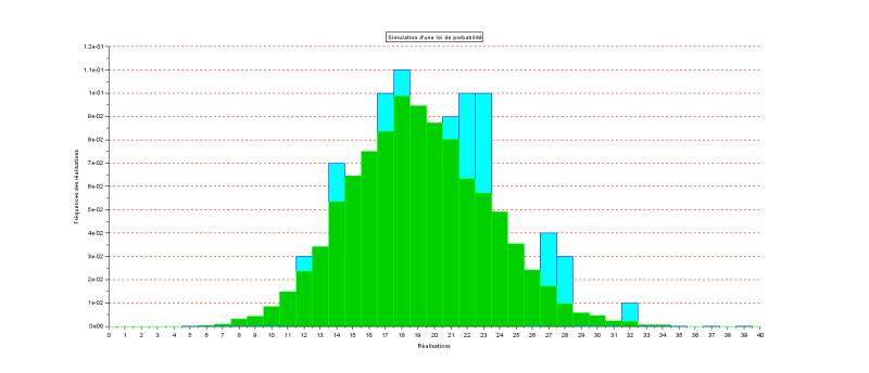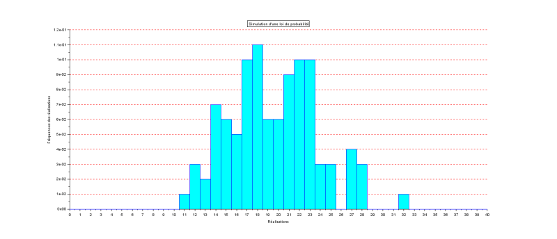 $$\begin{array}{|c|c|c|c|c|c|c|c|c|c|c|c|c|c|c|c|c|c|c|c|} \hline 21 & 27 & 13 & 20 & 20 & 23 & 23 & 12 & 19 & 23 & 18 & 15 & 17 & 18 & 27 & 28 & 21 & 18 & 14 & 18 \\ \hline 20 & 16 & 28 & 23 & 12 & 16 & 15 & 22 & 18 & 23 & 25 & 17 & 17 & 21 & 17 & 19 & 15 & 22 & 18 & 14 \\ \hline 20 & 23 & 18 & 21 & 19 & 14 & 17 & 23 & 20 & 28 & 27 & 16 & 20 & 22 & 21 & 21 & 19 & 14 & 18 & 23 \\ \hline 12 & 22 & 22 & 16 & 18 & 17 & 22 & 21 & 22 & 23 & 32 & 23 & 18 & 17 & 15 & 14 & 13 & 14 & 22 & 17 \\ \hline 22 & 24 & 24 & 21 & 22 & 17 & 19 & 17 & 25 & 11 & 18 & 14 & 15 & 16 & 24 & 25 & 19 & 15 & 21 & 27 \\ \hline \end{array}$$ On visualise les résultats sous la forme d'un histogramme des fréquences :